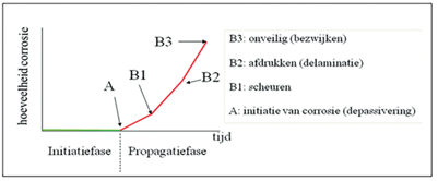 - Propagatiefase: de fase waarin wapeningscorrosie zich ontwikkelt.